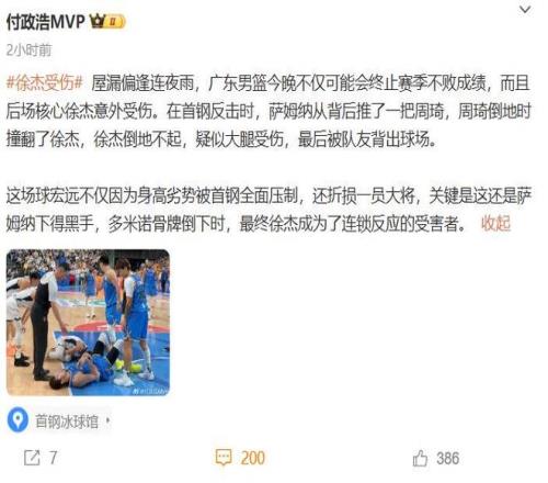 对于萨姆纳这一推,媒体人付政浩直接给出定性结论——这场球宏远不仅因为身高劣势被首钢全面压制,还折损一员大将,关键是这还是萨姆纳下得黑手,多米诺骨牌倒下时,最终徐杰成为了连锁反应的受害者。付政浩对于萨姆纳这种伤敌一千自损三千的行为非常不满,还在评论区追加评论认为:国家队正是用人之际,没悬念的比赛却把徐杰搞伤了,萨姆纳百死莫赎。